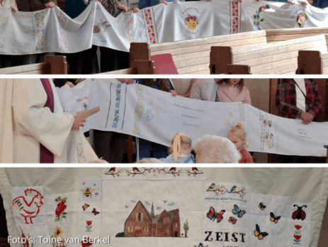 En nu, voor even, dragen wij in Zeist het mee. Een groep Oosterkerkers is al druk aan het borduren.